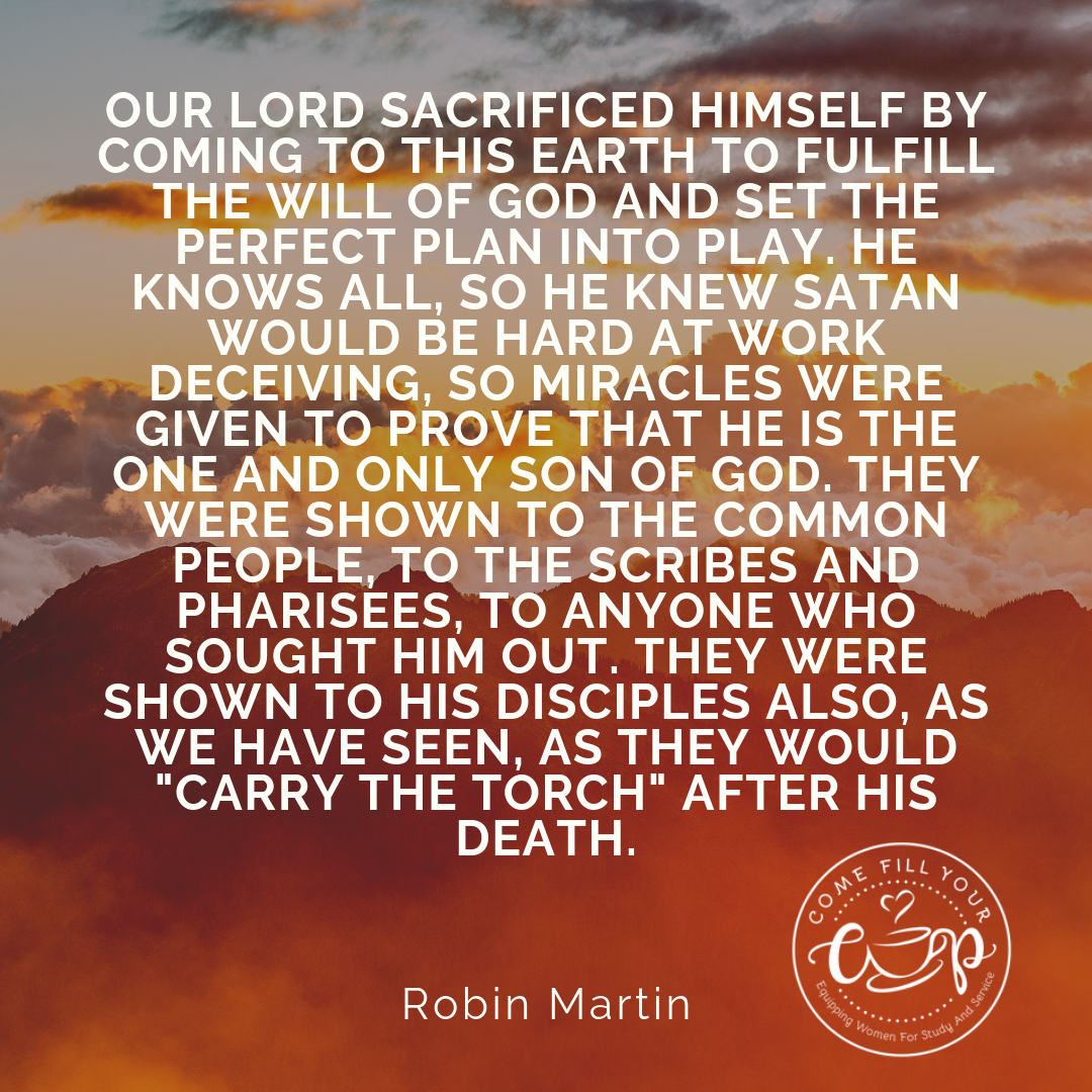 Our Lord sacrificed Himself by coming to this earth to fulfill the will of God and set the perfect plan into play. He knows all, so He knew Satan would be hard at work deceiving, so miracles were given to prove that He is the one and only Son of God. They were shown to the common people, to the Scribes and Pharisees, to anyone who sought Him out. They were shown to His disciples also, as we have seen, as they would “carry the torch” after His death.