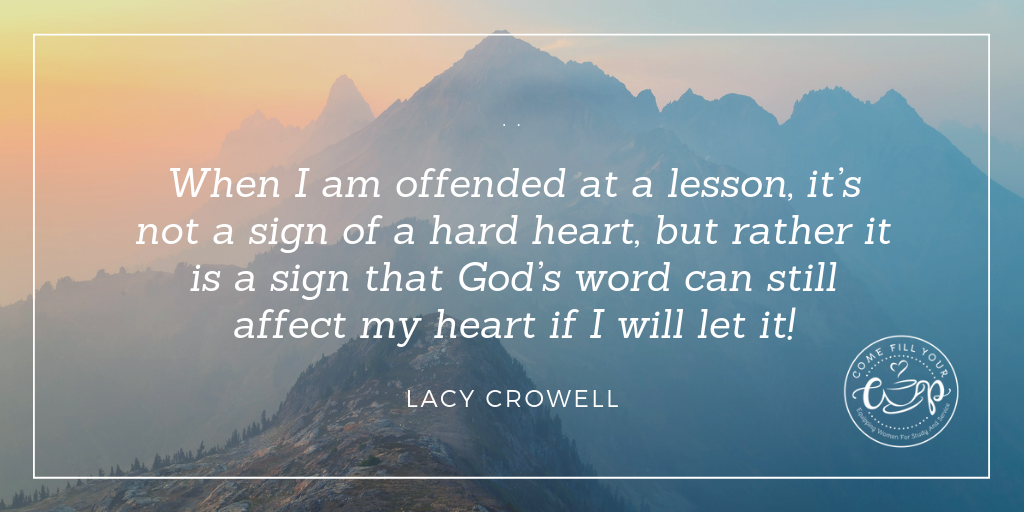 Until very recently this trend caused me considerable distress, to the extent that at times (I am ashamed to admit) I even felt hopeless about it. I am blessed to be married to an amazing, loving, Godly man, who also happens to be a minister of the Gospel. Just this past week my husband delivered one of “those” lessons (frequently referred to as “moving sermons” by those in the ministry). During his lesson he made a comment that forever changed the way I view the “political correctness” in the brotherhood, and it was this, “I know that there is a good chance I have stepped on many toes today, and I consider that a good thing. Why? Well let me ask you, what is the difference in an artificial leg and a real one? If you poke the real leg, you feel it.” Wow! What insight! When I am offended at a lesson, it’s not a sign of a hard heart, but rather it is a sign that God’s word can still affect my heart if I will let it!