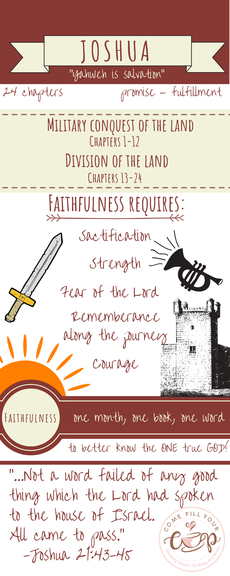 Like the Israelites, God calls us to do difficult things. Like Joshua, the choice is completely up to us if we will faithfully and courageously serve Him (24:15). It requires great dedication to go with God every step of the way, but thanks to books like Joshua, we can be confident God will be with us!