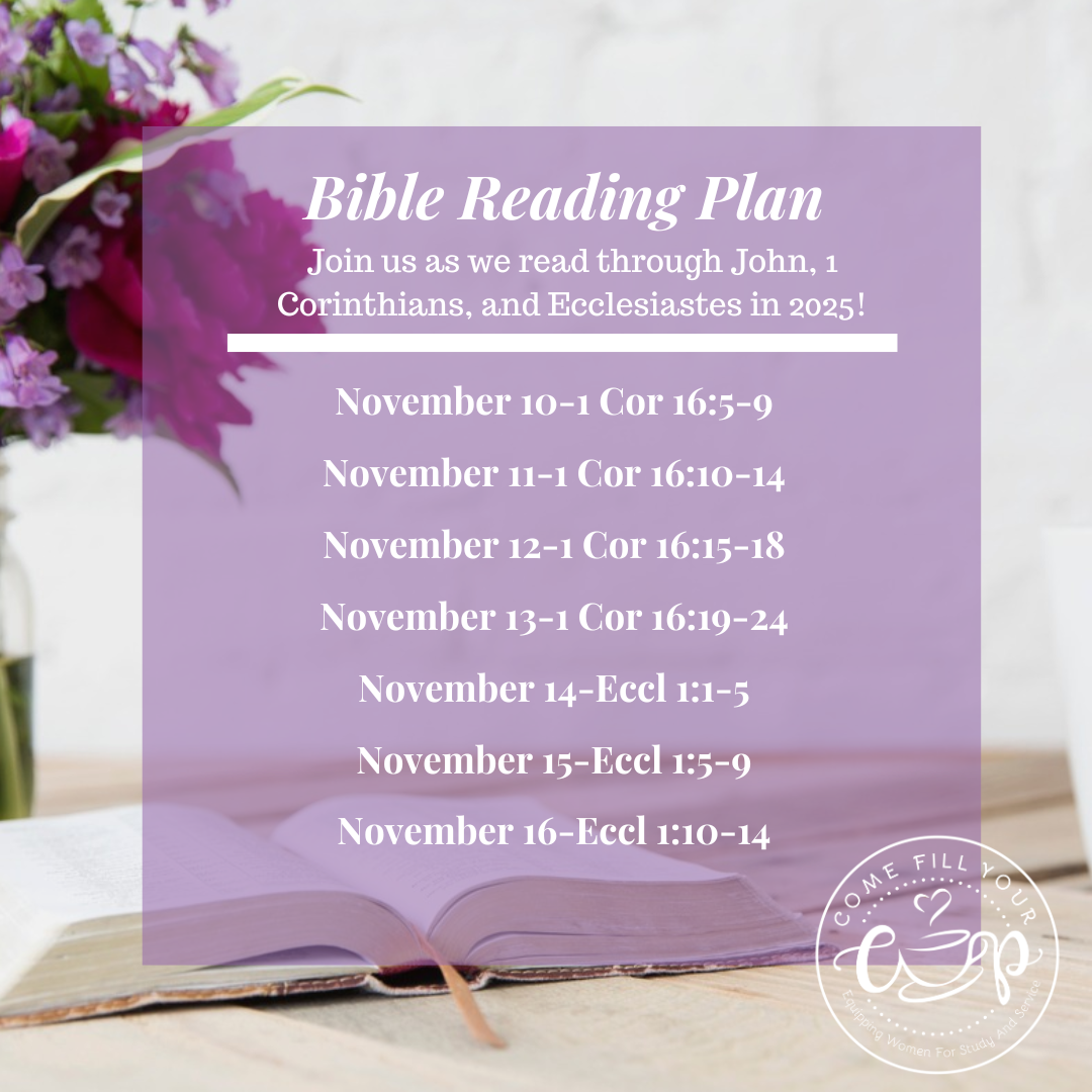 For the past several years, we have posted a daily Bible reading plan for each Monday of the year. This year, we are doing something special! Our dear friend, Carla Moore, has begun another fabulous Scripture Writing Challenge, and this year, it covers the books of John, 1 Corinthians, and Ecclesiastes. We know there are so many good studies and reading plans to participate in, so instead of muddying the waters with a different plan, we encourage all of our readers to participate in this journey through John, 1 Corinthians, and Ecclesiastes!