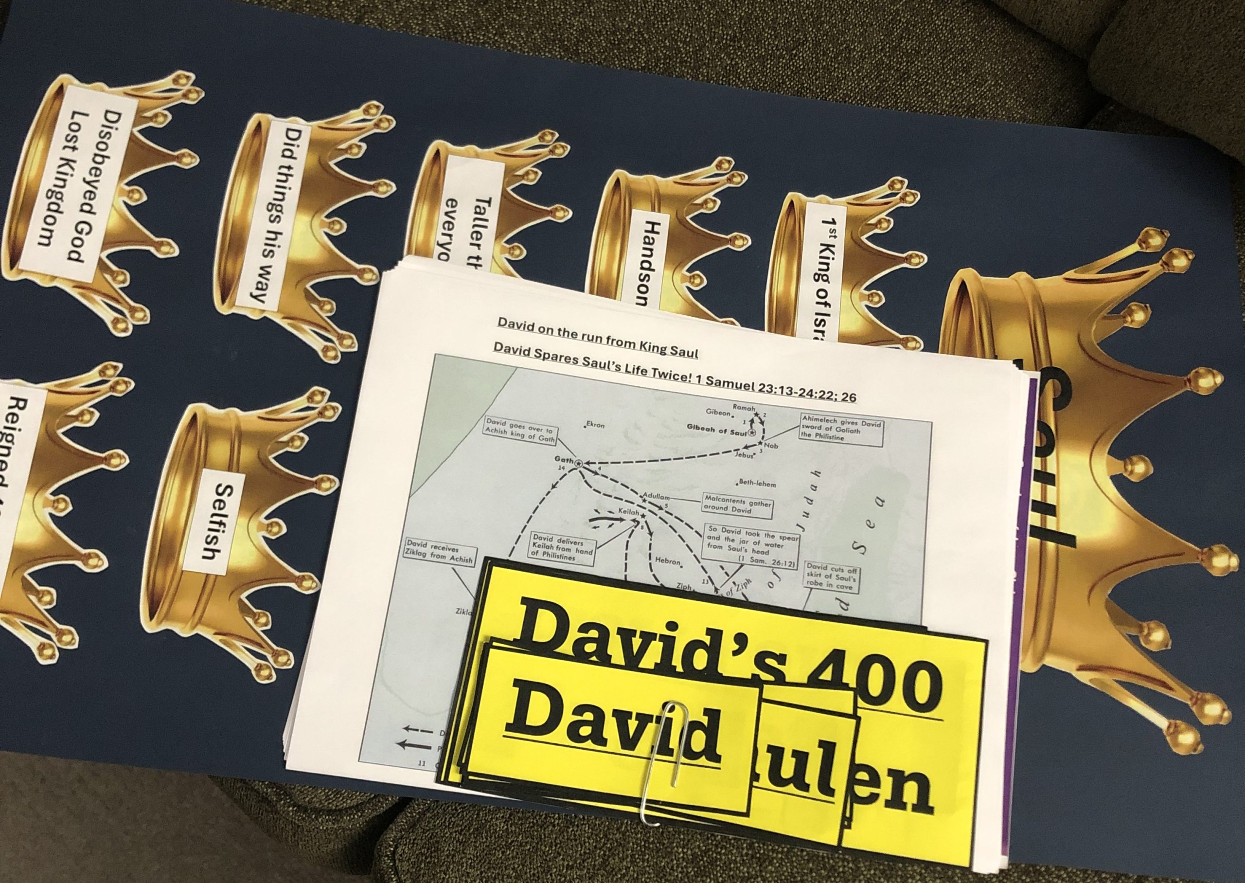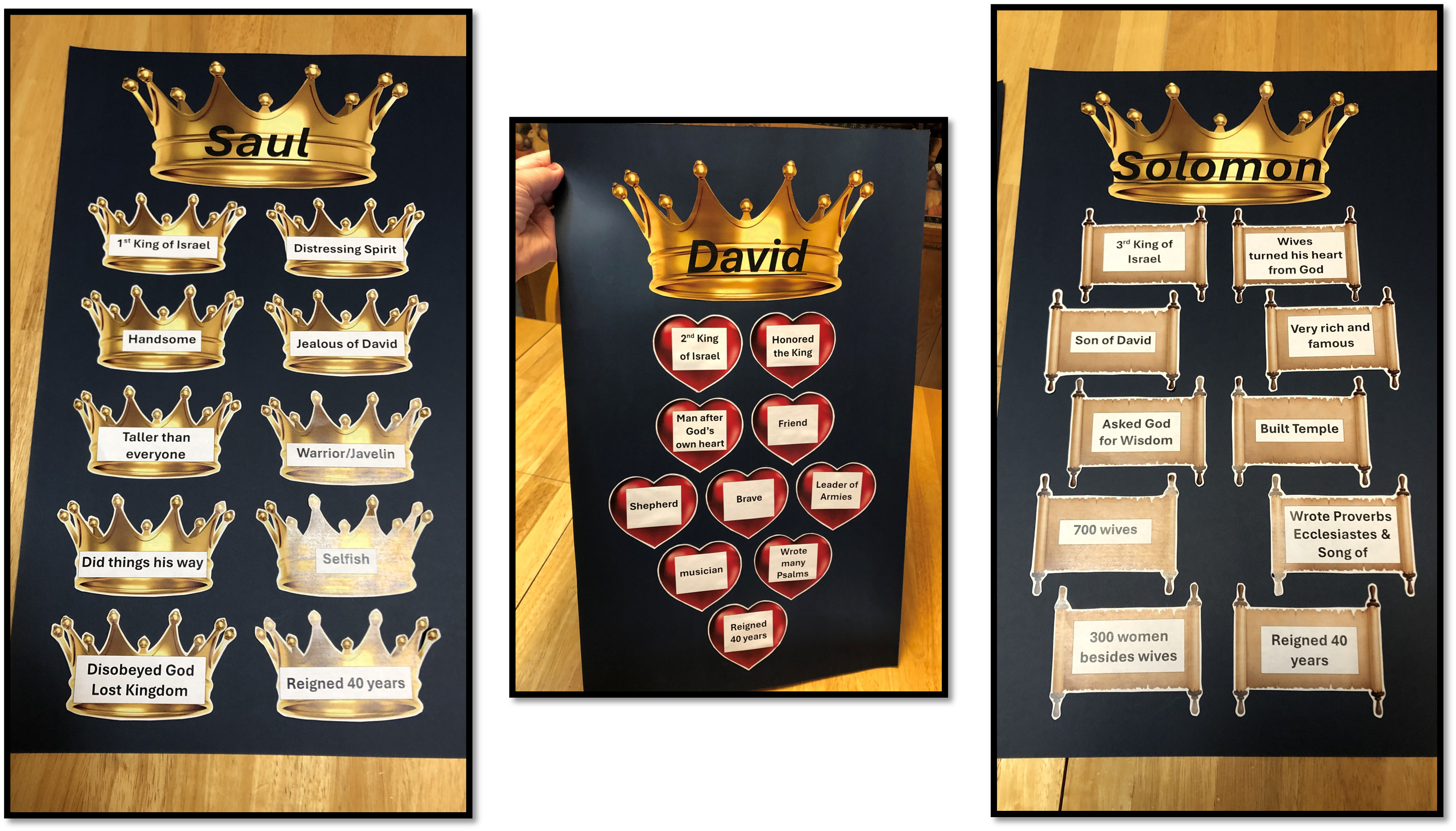 As Kathy had done, I used golden crowns for the facts about Saul, red hearts for the facts about David, and scrolls for the facts about Solomon.