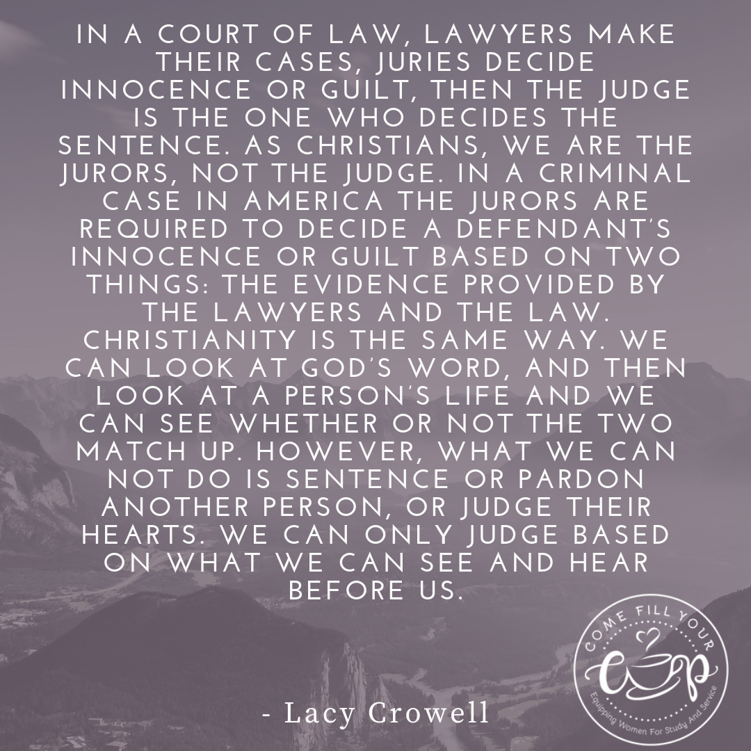 In this verse the word, “judge” is the Greek word krino, meaning, “to assume the office of judge.” In a court of law, lawyers make their cases, juries decide innocence or guilt, then the judge is the one who decides the sentence. As Christians, we are the jurors, NOT the judge. In a criminal case in America the jurors are required to decide a defendant’s innocence or guilt based on two things: the evidence provided by the lawyers and the law. Christianity is the same way. We can look at God’s Word, and then look at a person’s life and we can see whether or not the two match up. However, what we can NOT do is sentence or pardon another person, or judge their hearts. We can only judge based on what we can see and hear before us.